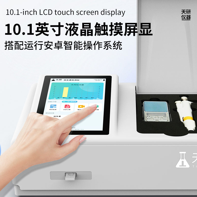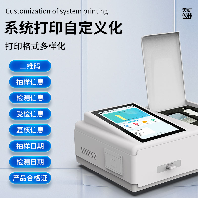 1、仪器采用10.1英寸液晶触摸屏,搭载安卓智能操作系统,主控芯片为RK3568 Cortex A55 四核64位处理器,**主频2.0G,运转速度快、性能强劲。 2、集成胶体金检测模块、数字化管理模块、无线通讯模块等,同一软件可完成所有检测项目,同一窗口展示检测结果。 3、一体化台式快检设备,交直流两用供电,可连接车载电源,配备6ah大容量充电锂电池,满足现场及流动检测需求。 4、自带数据集成模块,首页自动统计周/月检测数据、总检测数、合格数、不合格数,配套柱形分析图,直观快捷。 5、具备任务预设模块,送检前预设样品名称、检测指标、送检单位等信息,送检时一键调取,检测**便捷。 6、胶体金检测模块:直插式自动扫描,实时显示金标卡图像,自动分析CT曲线图、自动识别CT线,无需手动调整,检测后自动退卡;结果判定线可修改,对照值标定值断电不丢失;兼容市面主流胶体金卡,耗材不受限。 7、图像调整功能:可对金标卡读取图像多方位调整,提升结果读取精准度。 8、检测系统搭载大容量数据库,具备完善检索、修订功能;食品库可增删编辑样品名,产品库与历史记录支持一键检索。 9、自定义打印系统,支持打印国家标准合格证、二维码、抽样信息、检测信息、受检信息、复核信息、抽样日期、检测日期等内容。 10、A4纸报告打印功能:支持A4版与小票版两种报告模板,可通过WiFi、网线连接外置打印机打印。 11、支持WiFi联网、RJ45网线连接,数据可快速上传,同步对接食品安全监管平台,支持局域网/互联网上传,实现区域监管、大数据分析与安全预警。 12、支持U盘存储,标准USB接口免驱动,数据存储容量20万条以上,可生成Excel表格一键拷贝;具备登录保护,可设置用户密码与操作权限,支持重新校准、锁定、恢复出厂设置,固件可升级、检测项目可扩充。 13、支持远程升级,可分客户、分仪器定向更新,开机自动升级,系统版本可持续免费更新,无需返厂,降低成本与设备损坏风险。 |