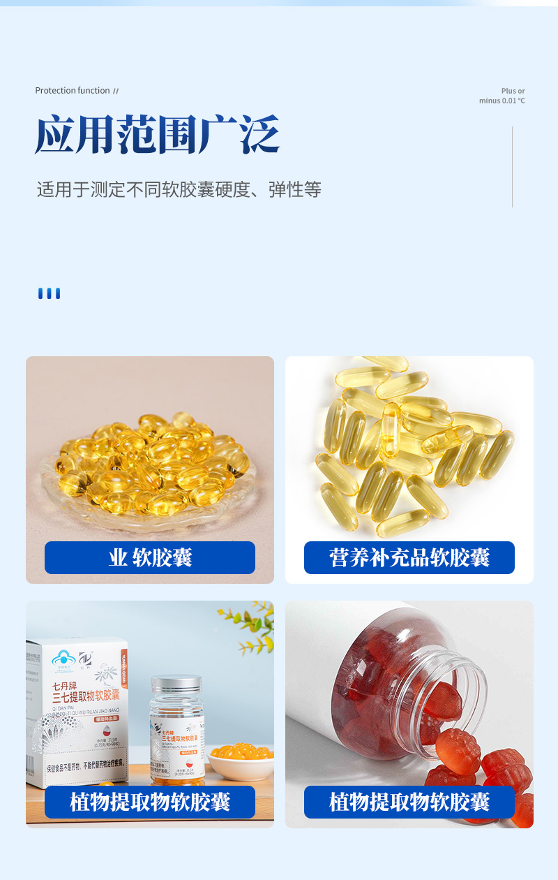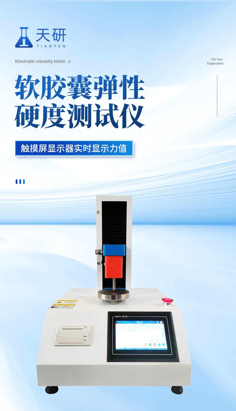 天研仪器 软胶囊弹性(硬度)测试仪 产品介绍: 软胶囊弹性(硬度)测试仪适用于测定各类软胶囊的硬度、弹性等物性指标,为产品配方优化与工艺制定提供精准参考数据。仪器别名:软胶囊硬度测定仪、软胶囊弹性测定仪。 测试原理: 通过下压测试测定软胶囊